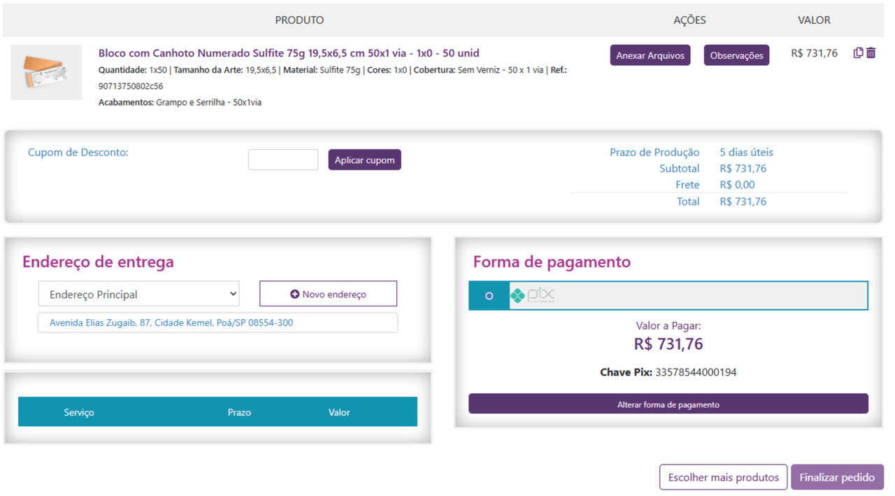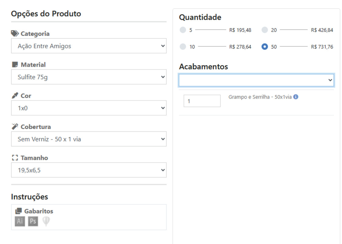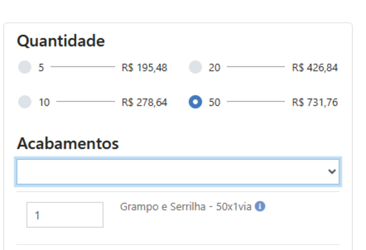 Após ter selecionado todos os filtros e montado seu material com as opções desejadas, aparecerá abaixo quais opções de acabamento estão disponíveis para o produto, assim como, o valor e prazo para cada acabamento. Caso o produto não possua acabamentos adicionais disponíveis, não aparecerão opções ao lado.