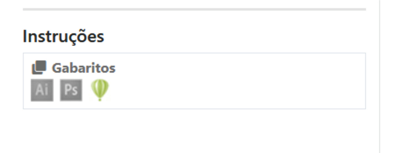 Nesta mesma página você poderá fazer o download do gabarito do produto, disponível nos programas Corel Draw, Illustrator e Photoshop. O download é gratuito e a utilização do gabarito é obrigatória para garantir que a arte gráfica esteja dentro dos padrões de impressão aceitos pela gráfica.