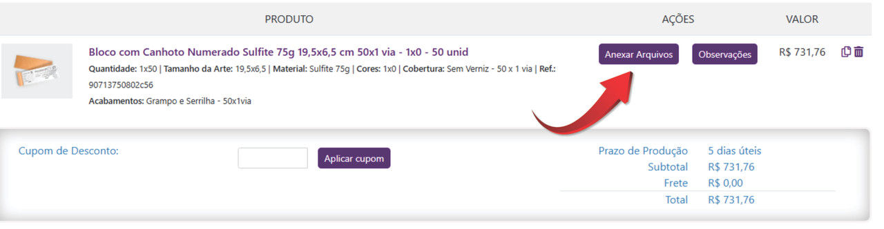 Confira atentamente as informações sobre o produto na aba “Opções do Produto”. Depois, verifique (e, se necessário altere) o número de unidades do produto e marque o(s) acabamento(s), caso deseje.